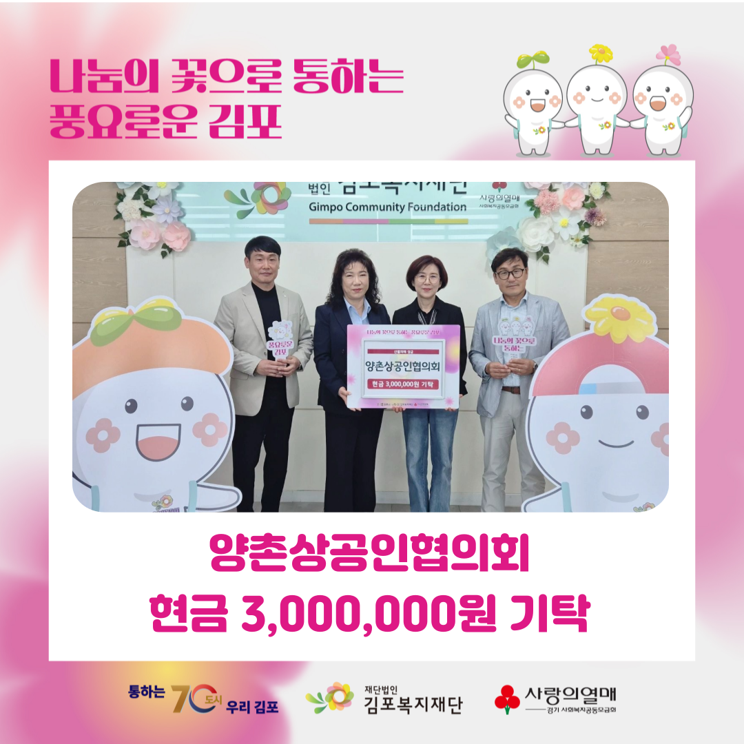 2025년 4월 29일(화) 양촌상공인협의회에서 영남지역 산불피해를 입은 주민들을 위해 현금 3,000,000원을 기탁해주셨습니다.