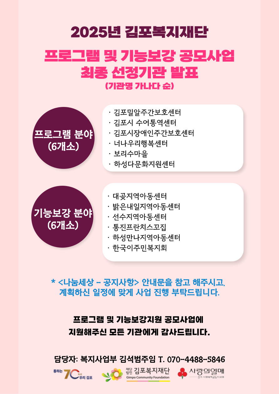 “2025년 프로그램 및 기능보강 공모사업” 선정 기관 결과 안내 드립니다.