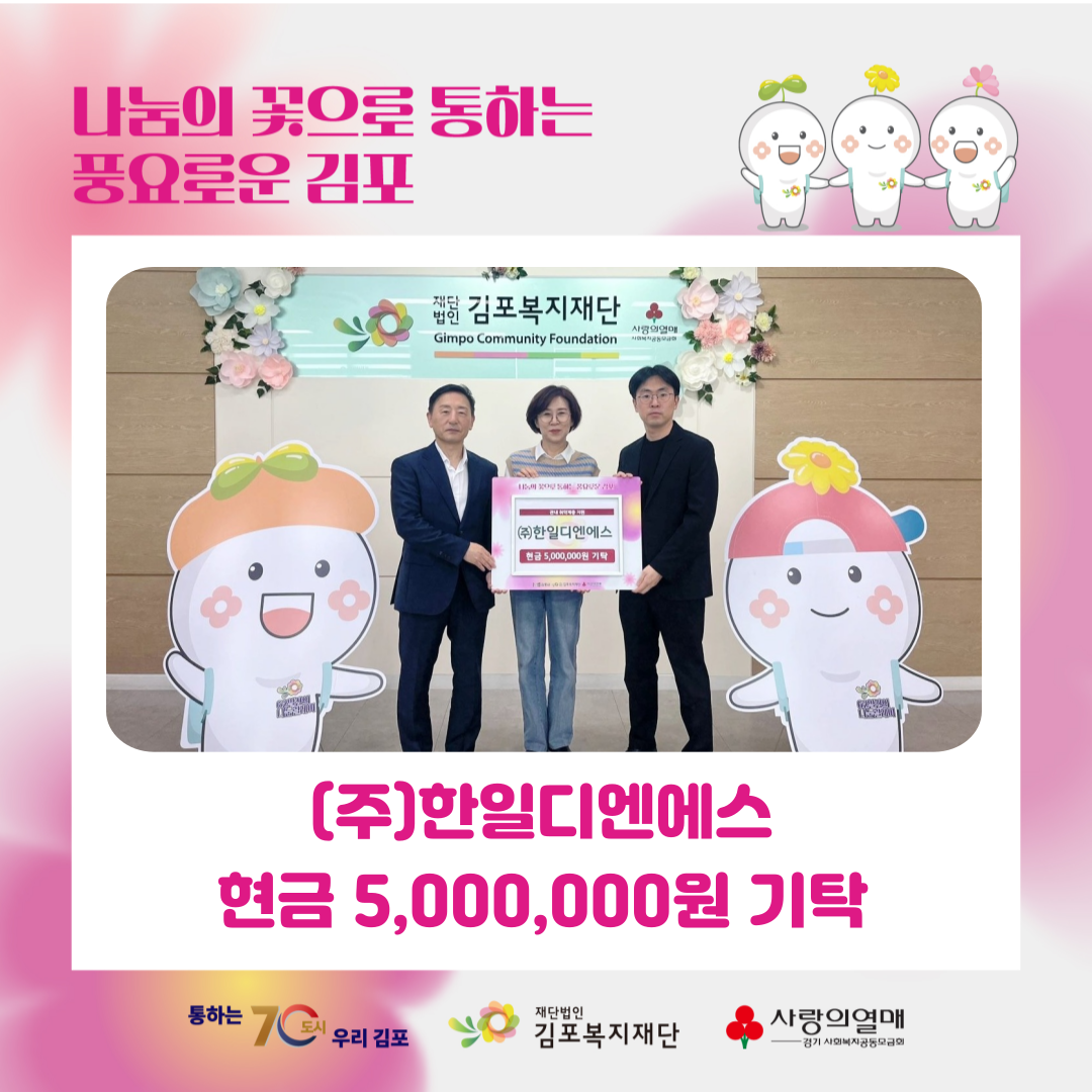 2025년 4월 30일(수) 통진읍에 위치한 (주)한일디엔에스에서 김포 내 주민들의 복지 향상을 위하여 현금 5,000,000원을 기탁해주셨습니다.