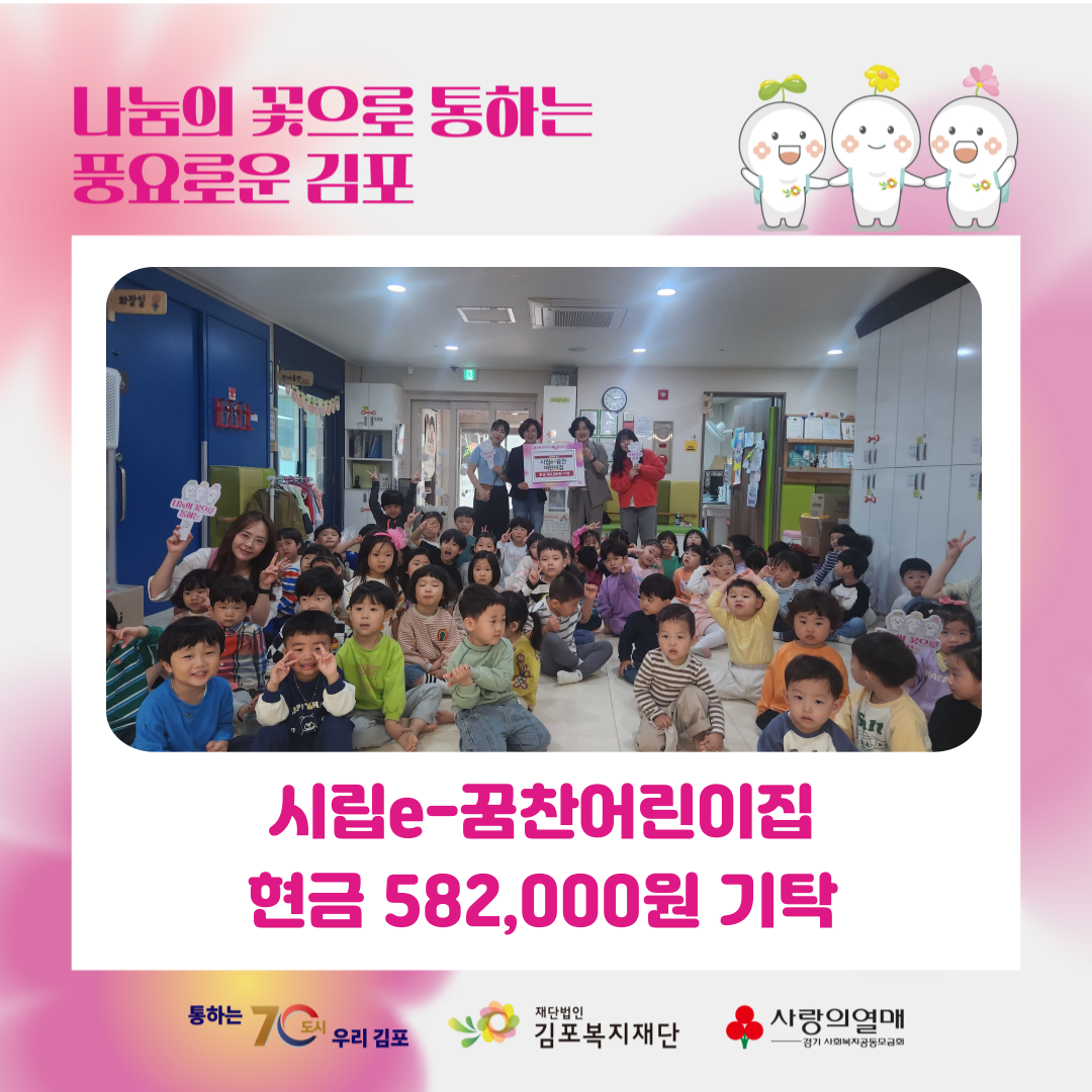 2025년 5월 7일 (수) 마산동에 위치한 시립e-꿈찬어린이집에서 산불모금으로 582,000원을 기탁하였습니다.
