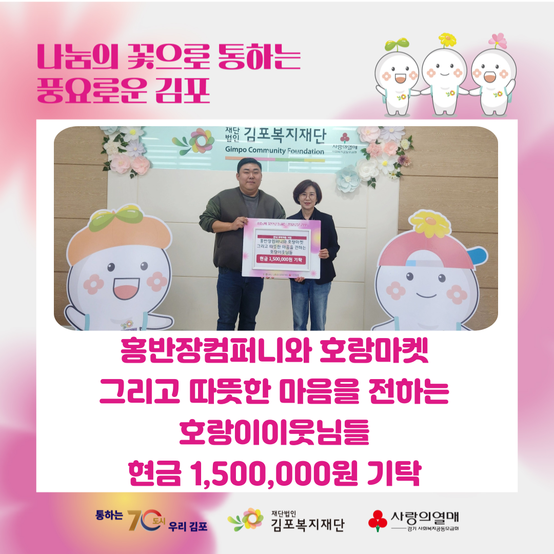 2025년 5월 7일(수) 김포 내 5곳의 호랑마켓 매장이 있는 (주)홍반장 컴퍼니에서 김포, 파주, 일산 내 주부 1,500명 분들이 1,000원씩 물품구입에 따른 기부를 받아 현금 1,500,000원을 기탁해주셨습니다.