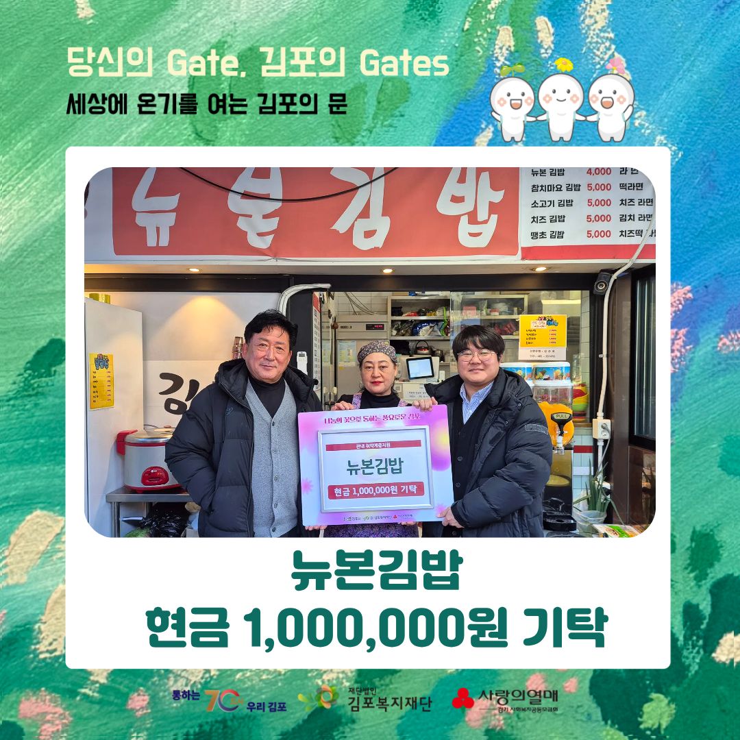 2025년 12월 8일, 뉴본김밥에서 현금 1,000,000원을 기탁해주셨습니다.