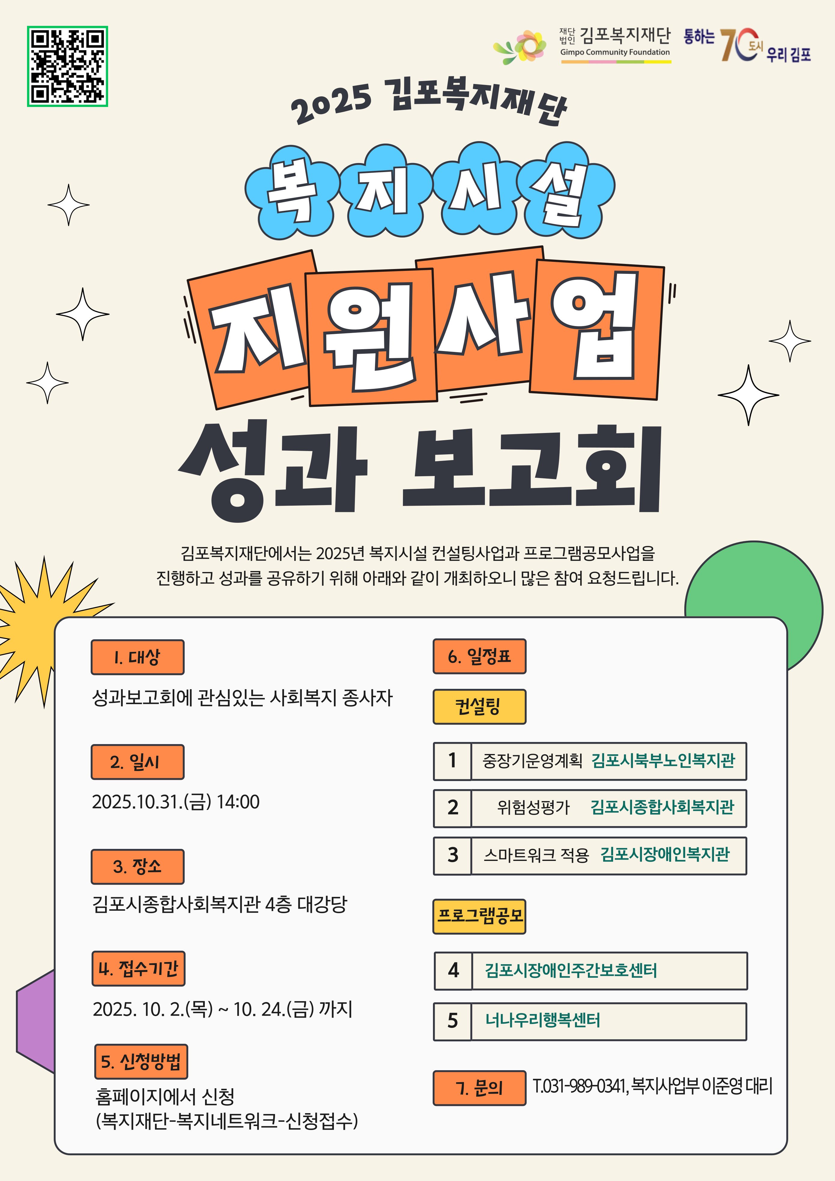 2025년 10월 31일, 김포복지재단에서 사회복지시설지원사업 성과보고회를 진행합니다. 많은 참여 요청드립니다.